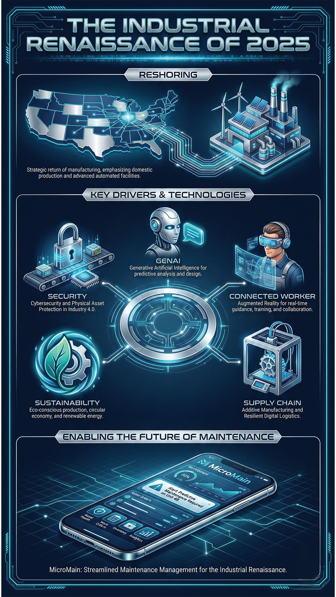 The global manufacturing sector in 2025 stands at a pivotal historical juncture, characterized by a simultaneous convergence of geopolitical restructuring, unprecedented technological acceleration, and a fundamental reimagining of the human role in production. We are no longer merely in the era of “Industry 4.0,” which emphasized connectivity and data collection; the industry has aggressively pivoted toward an era defined by cognitive agency, resilience, and sustainability—often termed Industry 5.0. This report provides an exhaustive analysis of the current state of manufacturing, specifically tailored to provide strategic depth for Computerized Maintenance Management System (CMMS) and Enterprise Asset Management (EAM) providers.